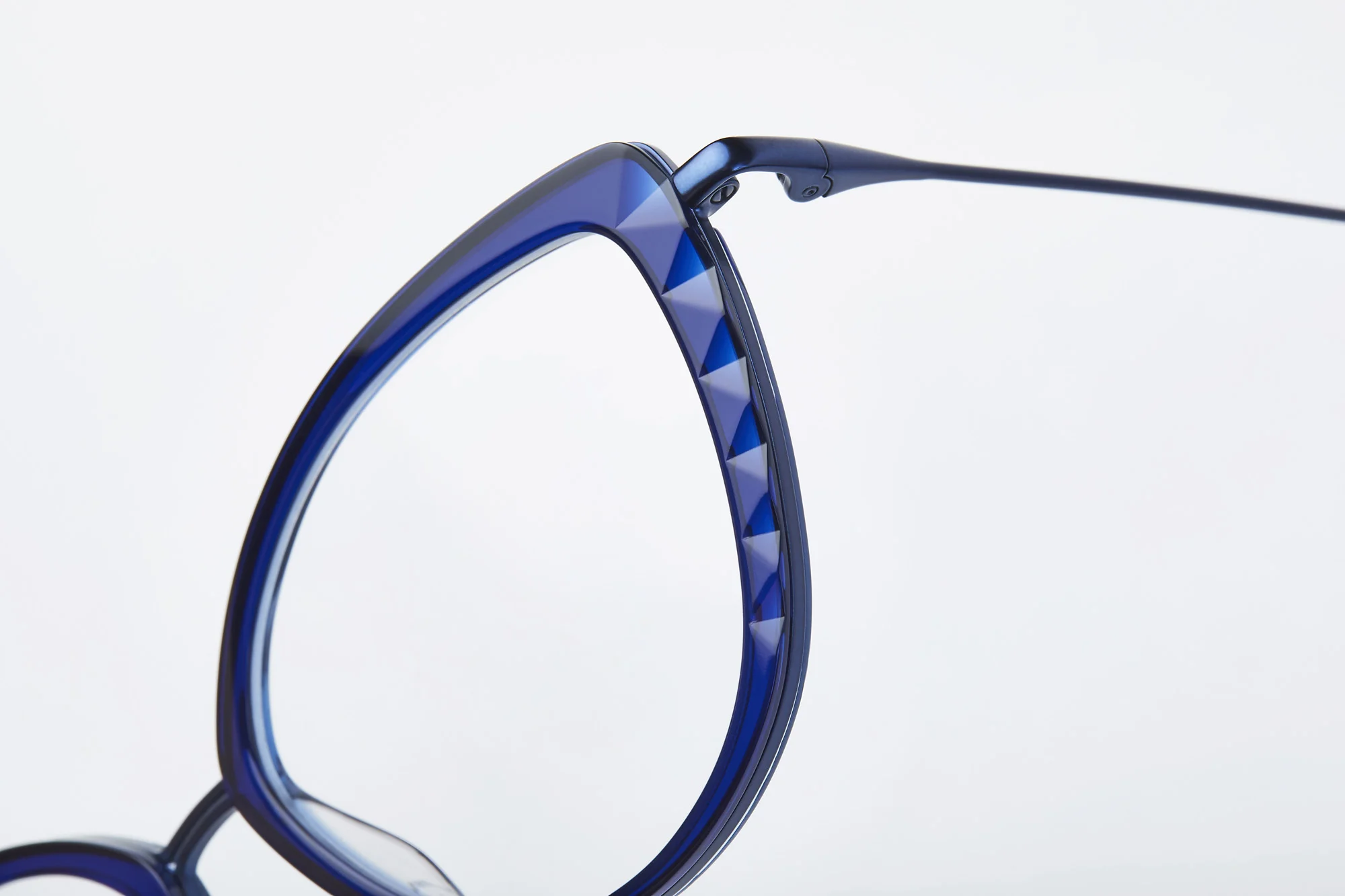 As sharp as a diamond, these intricate angles play over mono colour acetates to form an intriguing geometric concept. Technical in its design, the geometric cutaways reveal different shades of colour.