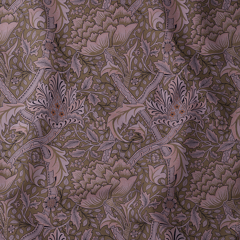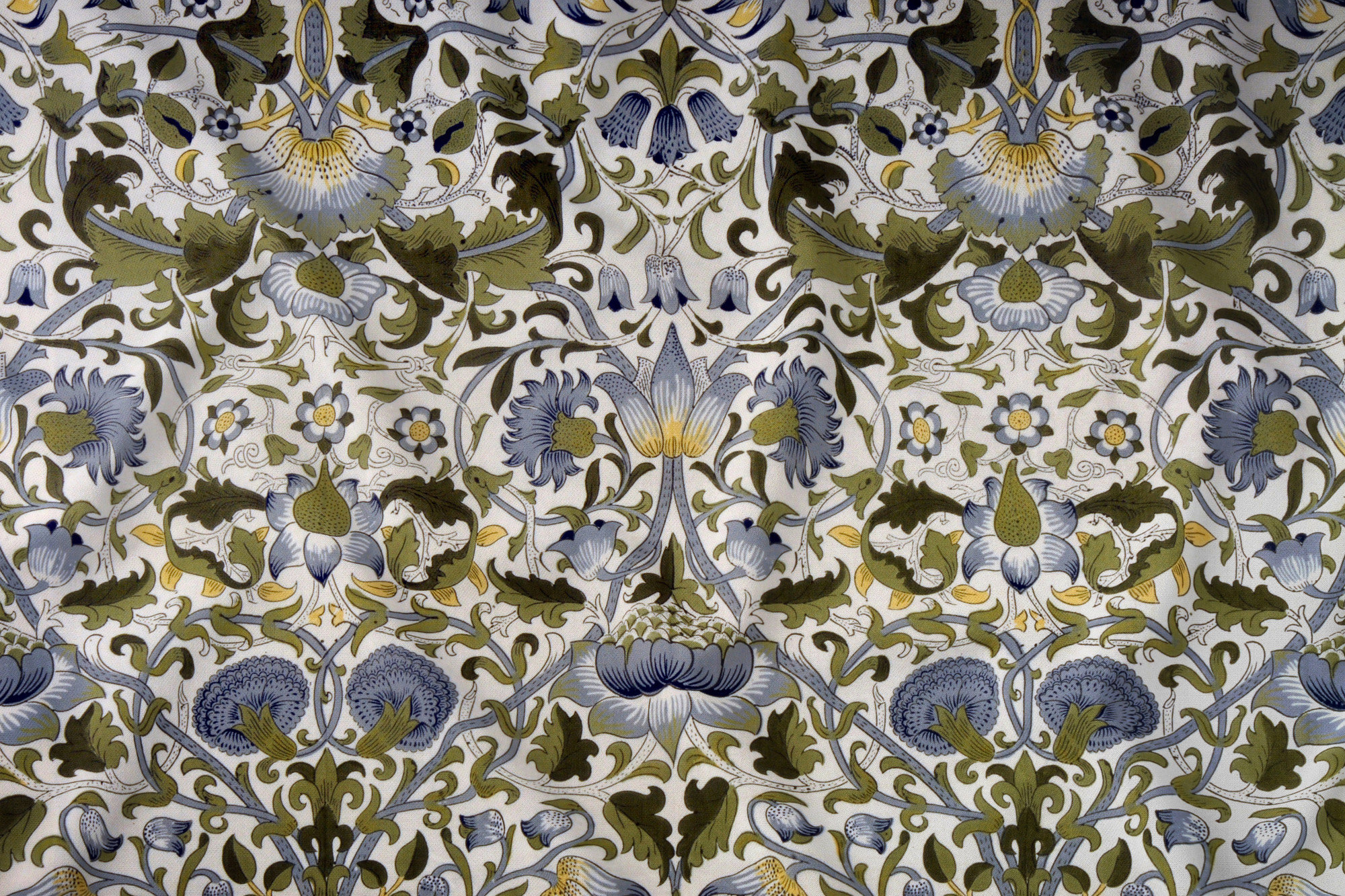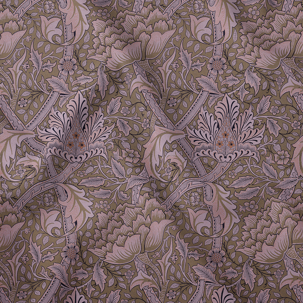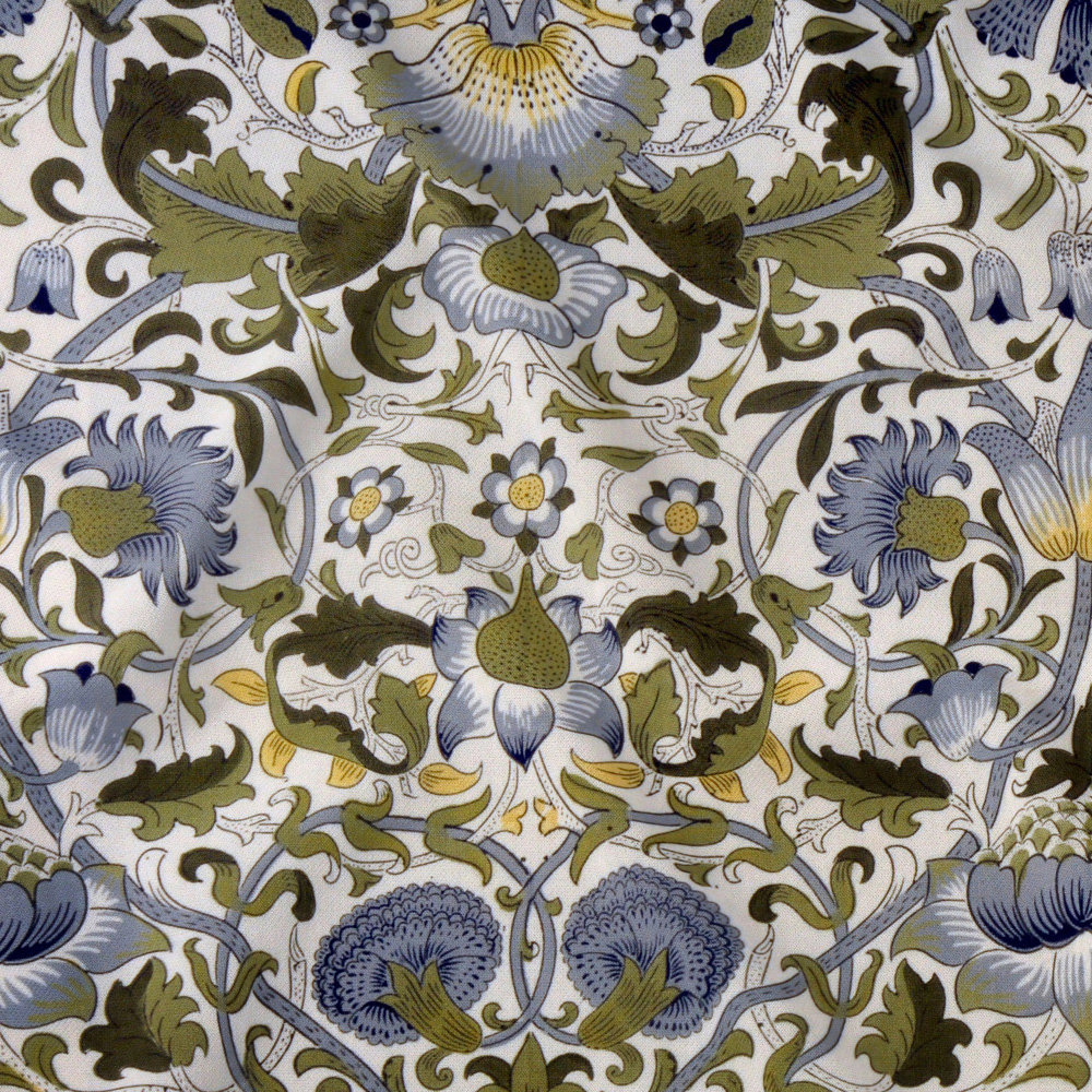 Lodden was designed by William Morris and block printed onto cotton fabrics. Lodden has a very large repeating pattern and shows intricate scrolling flowers with foliage in gold, greens and silver grey.
